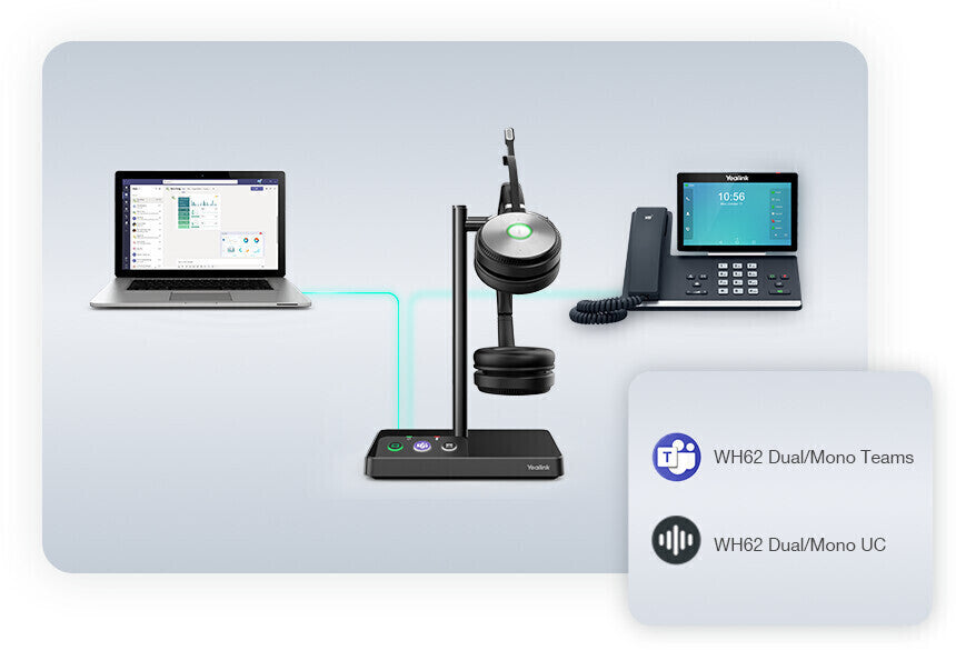 Das Yealink WH62 Dual Teams ist ein kabelloses DECT-Headset, speziell entwickelt für die nahtlose Integration mit Microsoft Teams. Mit dedizierter Teams-Taste und optimierter Benutzerführung erleben Sie professionelle Kommunikation auf Knopfdruck – ideal fürs Büro und Homeoffice.